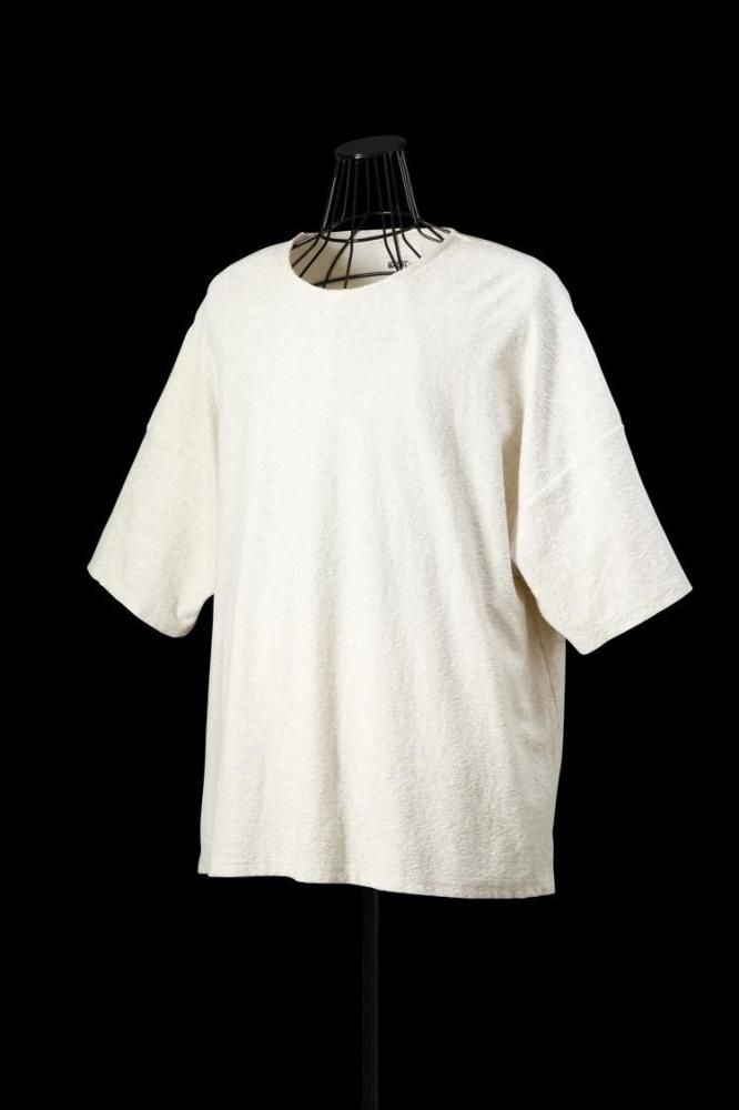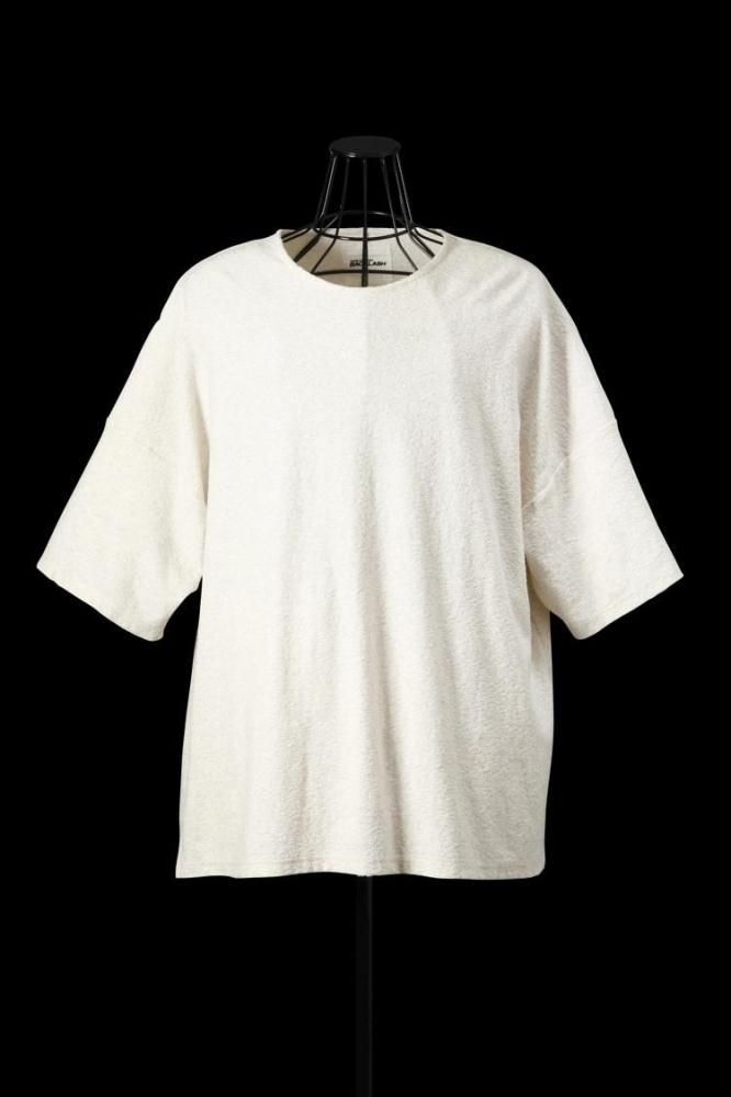 極端に肩をドロップさせ身幅も横長のボックス・シェイプを容採ったオーバーフィッティング、ファブリックの特性も相まったリラックス感を強く追求したカットソー。ルーズな感覚での着用も素材の落ち感により、自然なシルエットで着用いただけます。五分袖、SorLの2サイズ展開となっております。裾がサイドスリット、スクエアカットになります。