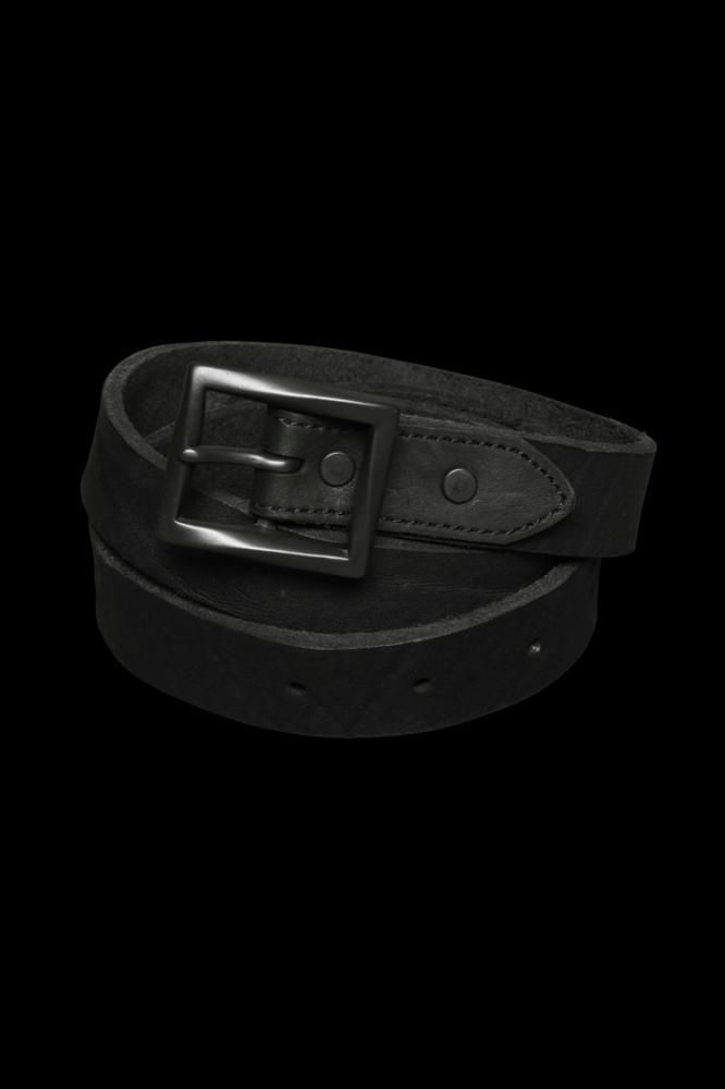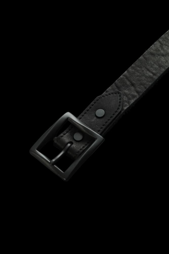 荒さを持った迫力のあるダブルショルダー製品染めベルトシリーズの中で、これまで展開のなかった30mm巾を新たに展開。40mmや50mmと比較すると細巾の印象ですが、革の表情も加わり十分な存在感を感じていただけます。形状はシンプルなものの適度な重厚感をもたらす真鍮製スクエアバックルを装着したベルトになります。ベルトの剣先はV字型になります。