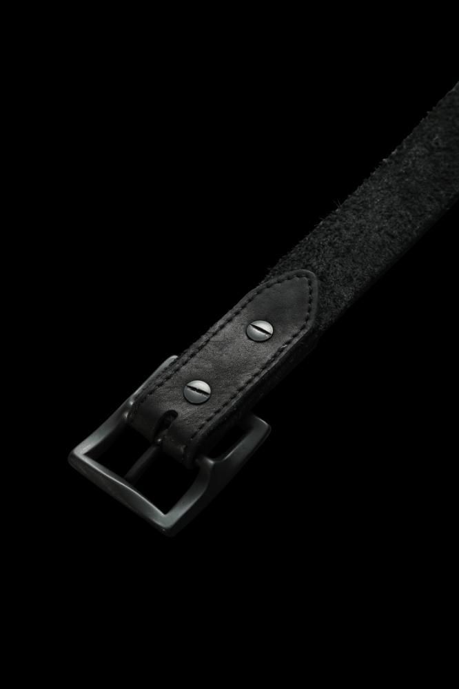 ブランドを代表する国内のタンナーにより丁寧に仕上げられた高品質国産ダブルショルダーレザーを採用。極めて元厚に近いショルダーレザーの下地を敢えてそのまま使用し、更に製品染め加工を施すことにより粗野でいて存在感の強い風合いを作り上げています。製品基のカサっとした質感は使用に伴い油分が浮き上がり、驚くほどに滑らかな艶のある表情に変化します。デイリーユースのベルトこそのダブルショルダーレザー特有の硬質な質感が柔軟に深化するエイジングを最も感じていただきやすいプロダクション。使用者のみが堪能することが出来る唯一無二のレザーベルトです。