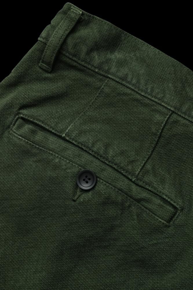 ワイドシルエットをベースに裾にかけ程よくテーパードを効かせた新たなシルエットパターンを構築。比較的シンプルなワイドパンツに仕上げつつも、微妙なテーパードの効いたレングスラインやタックを取ることにより野暮ったさのない美しいシルエットを形成します。フロント釦フライ、タフな生地感とシンプルなデザイン性をベースに、着用に伴う経年変化を味わいながら永くご着用いただきたい一本に仕上がっています。