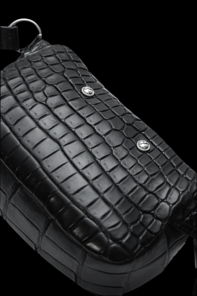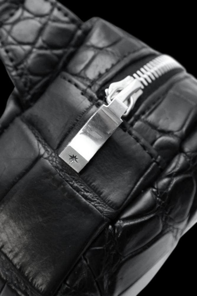 ハイエンドライン「BACKLASH The Line」にて展開するショルダーポーチ。エキゾチックレザーの最高峰クロコダイルの皮革を大胆にメインマテリアルに使用しています。鰐革でしか味わえない野性味の強い迫力のある抜群の存在感を放つ表情に加えて、オリジナルでシルバー925製で製作したファスナースライダー、クロスリベットを装着することによりハイエンドラインのみで表現可能なラグジュアリーなバッグになっています。ベースのファスナーにはriri社製のものの中でも最も光沢を放つシルバーメッキが施されたタイプを採用、手軽な開閉が可能な滑らかな滑りになっています。多種多様な鰐革の中でも均整が取れた表情の良いもののみを選別し、丁寧に鞣し、加脂工程を重ね鰐革の中でも耐久性のある仕上がりになっています。オイルを多量に含んだクロコダイルレザーは、製品元よりマット質感の印象ですが、使用に伴い光沢を放つ艶味を確実に増していきます。ショルダーストラップには耐久性を考慮したイタリアンレザー(牛革)を採用しています。