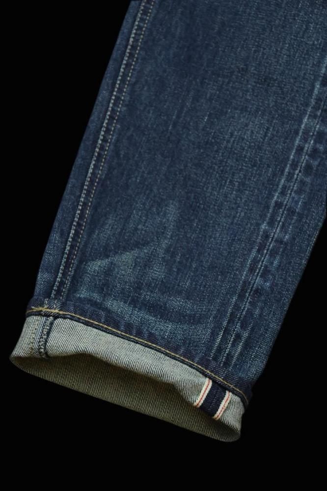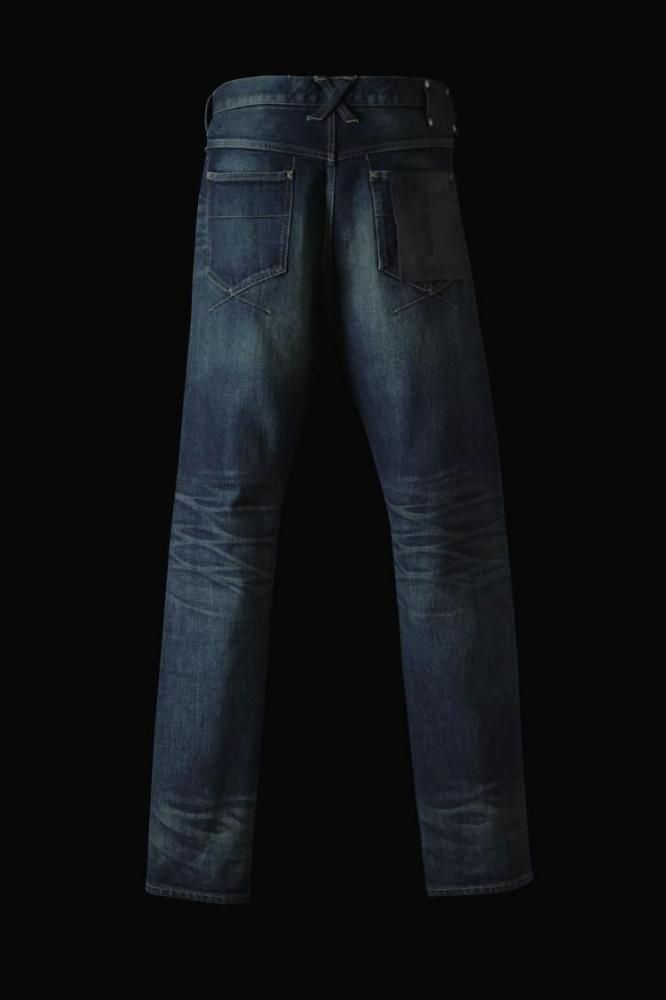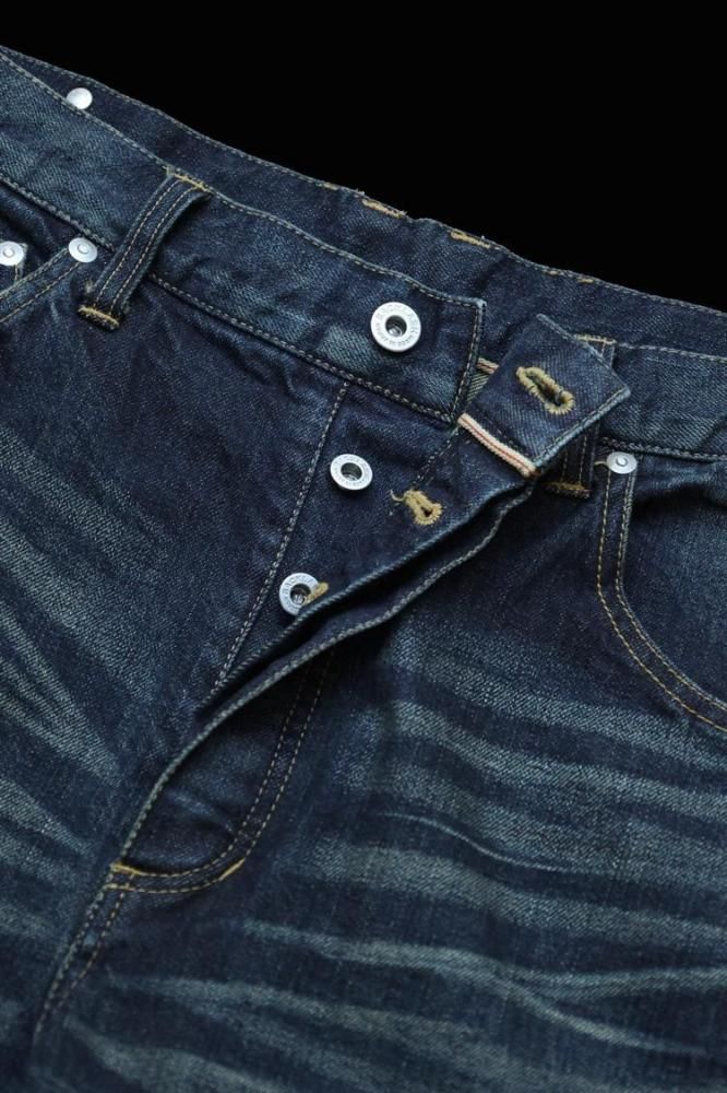 タテ7番インディゴ中白糸、ヨコ8番生成り糸を使用し、タテ糸ヨコ糸の太さを変えて織り上げたストレッチ混の"HIROSHIMAセルビッチデニム"をベースマテリアルに採用しております。ヨコ糸に生成り糸を用いることでシンプルにワンウォッシュを施した際にも、雰囲気は非常に味わい深い表情に仕上がっています。濃色加工(ダークインディゴ)に関しては、部分的なシェービングを行い、プレスで形を整えた後に、全体の擦りを再度入れております。その後、立体加工/ストーンウォッシュ/オーバーダイの工程を経た後に、吹き付け加工により細かく濃淡を付けフィニッシュした加工デニムになっています。スレキに施した文字、【REACH FOR THE MOON EVEN IF WE CANT. 〜月に手を伸ばせ、たとえ届かなくても。】は、デザイナー・ISAMU KATAYAMAに今なおインスピレーションを与えるロックワードです。