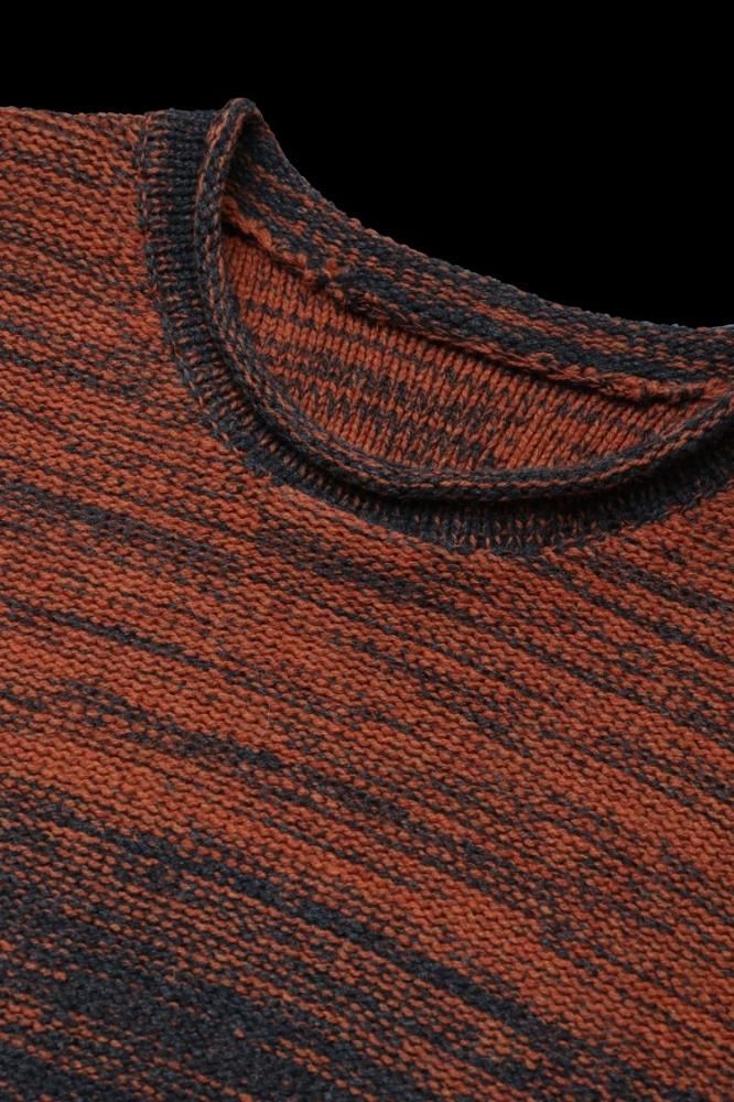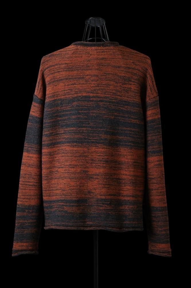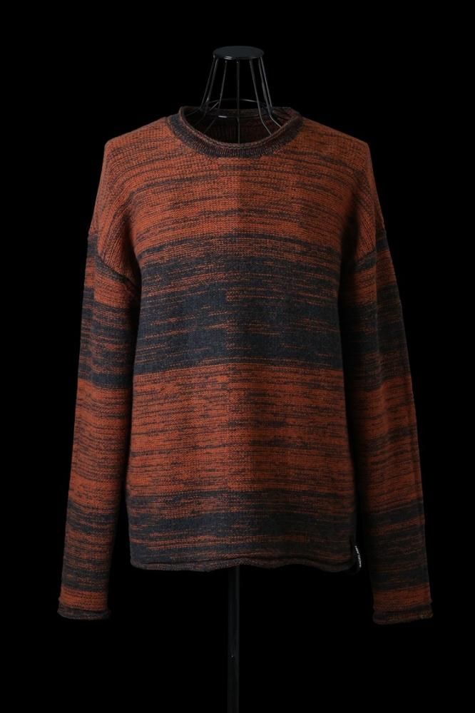 地平線を連想する配色/デザインを程よく重厚感のあるニットによって構築。デザイン感のあるニットを最大限に押し出したシンプルなプルオーバーデザイン。適度に余裕のあるシルエット設計に加えて、伸縮性のある畦編みニットによるリラックス感を持ってラフに着用可能なウールニットになっています。