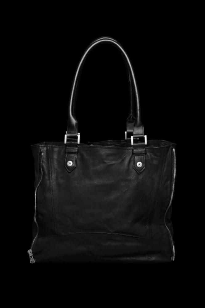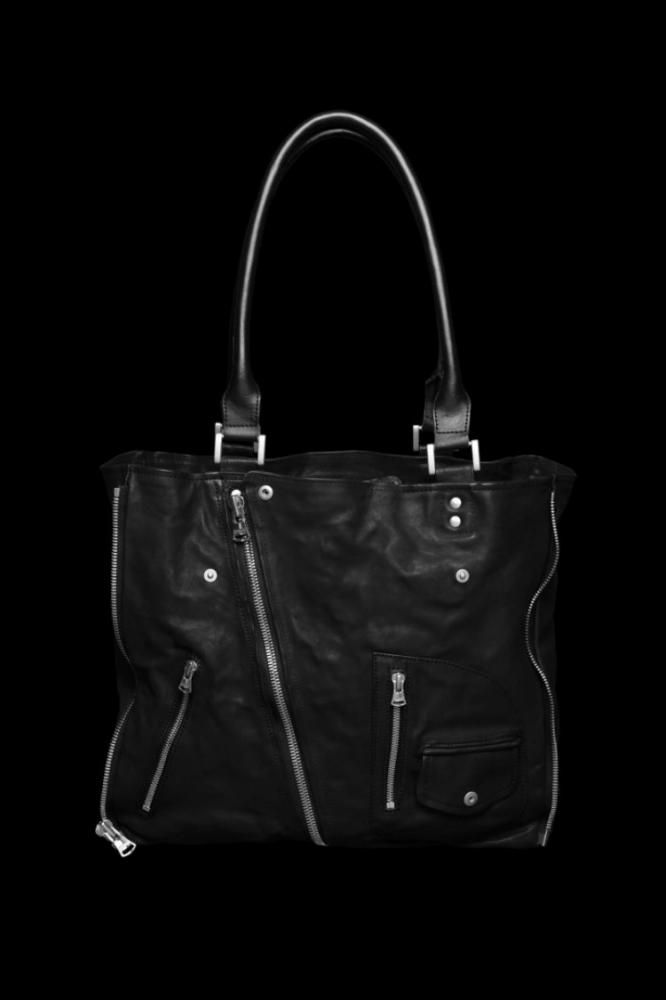内側ファスナーポケットを配備したメイン収納スペースはシンプルな構造により、容量を最大限活用したトートバッグ。サイドマチにファスナーを配備し、内容物の収納量に合わせてバッグ本体のシルエットの調整が可能になっています。本体フロント部分に対し、ダブルライダースをイメージしたデザインディテールをプラス。ライダースジャケットを代表するファスナーを3本とコインポケット1箇所を配備し、実際に全ての箇所外側ポケットとして使うことが可能な仕様になっています。手荷物を細かく分けて収納、持ち運び出し入れすることが可能なデザイン性は勿論、機能性にも特化しています。マチをしっかりと設けた点により、収納量に加えて物の出し入れにも便利です。ハンドルは男性が肩からも掛けていただける長さに設定しています。敢えて少し小さめに設計したトートバッグは、扱いやすくカジュアルシーンにおいても持ちやすいサイズ感です。ライダースをイメージとしたデザインを落とし込み、製品加工を施すことにより存在感の強いイメージのトートバッグになりますが、サイズ感に加えてカーフレザーをマテリアルに用いることにより柔らかな印象、抜群に手馴染みの良いソフトな質感に変貌したアジのある表情に深化していくにつれ、派手過ぎない雰囲気になります。全ての箇所に裏地を配備しています。