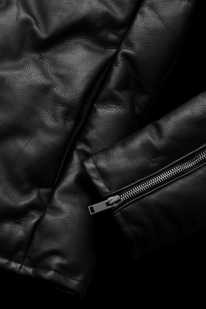 ステッチダウンシリーズで採用する皮革で最上級ランクのレザーマテリアルを使用し製作したスペシャルな一着(※「BACKLASH The Line」で展開するステッチダウンを除く)。高品質ベビーカーフレザーの下地を採用、ラグジュアリーな趣きを最大限に纏い、迫力のあるオーラを放つ荘厳さを大事に革は0.8mm厚で使用しております。厚みに対する重みはそれほどに感じません。適度な厚みのあるカーフレザーを用いることにより、心地の良い着用感を保ちつつ、「レザーダウンとしての重厚感」を高次元で追求し完成したレザーマテリアルによるステッチダウンジャケット。