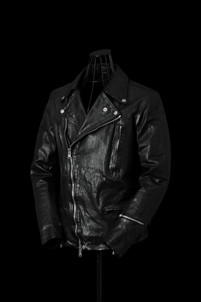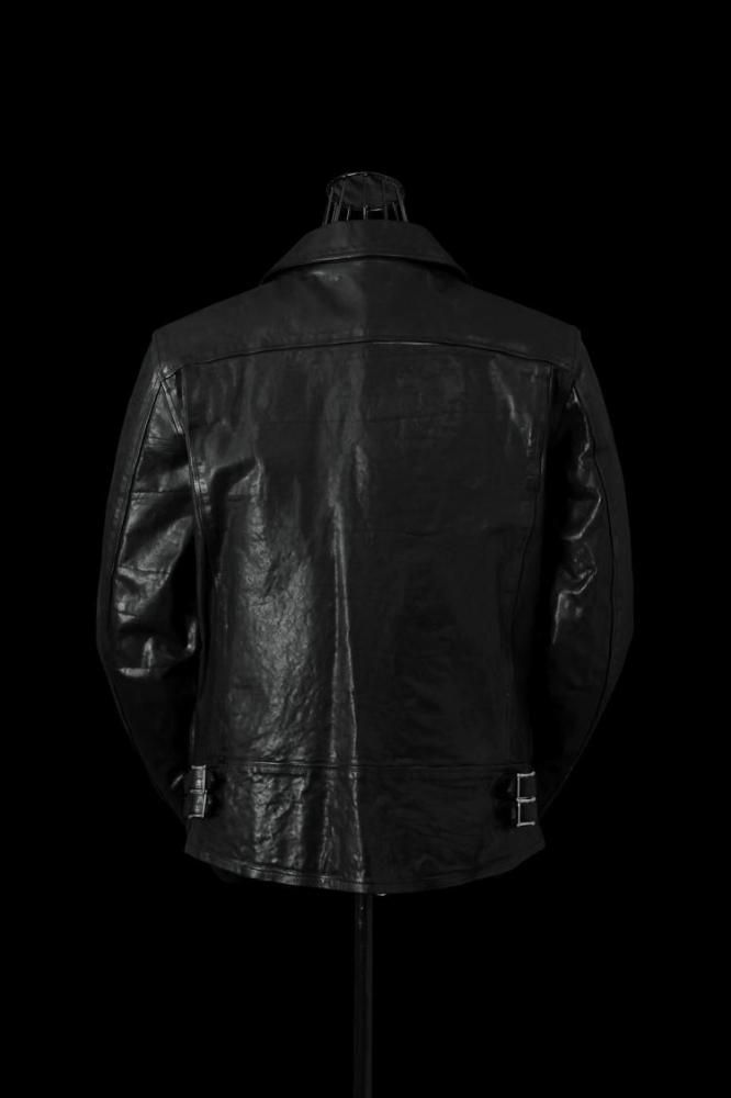 0.8-0.9mm厚のフランス産ダブルショルダーの皮をタンニン鞣しした下地を採用。多分にオイルを含んだ下地をベースに、製品染色を施工。製品染色の段階で仕上がりの色に比べ、低い濃度に染色し、その後表面にワックスをかけた状態でアイロンを当て熱量のコントロールによって焦がし色を濃く仕上げています。製品染色による陰影を伴ったムラのある表情に、ワックス焦がしの加工行程が加わることにより一層アジのあるやれこなしたような適度なナチュラルヴィンテージの風合いを表現しています。イタリアンダブルショルダー製品染めシリーズとはまた異なる独自の存在感を放つ一着。成牛の肩の部分の革を使用した肉厚で重厚感のある硬質な質感が基ですが、ワックスの油分感が加わったヌメりのあるプルアップレザー特有の質感。適度なハリのある最初のハードな感覚は、着用を重ねる毎にしっとりと柔らかく、艶感が変化しより一層味わいのある雰囲気に深化していきます。