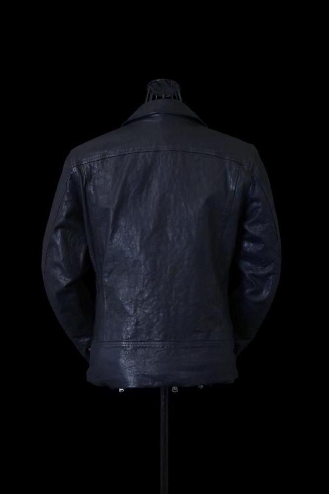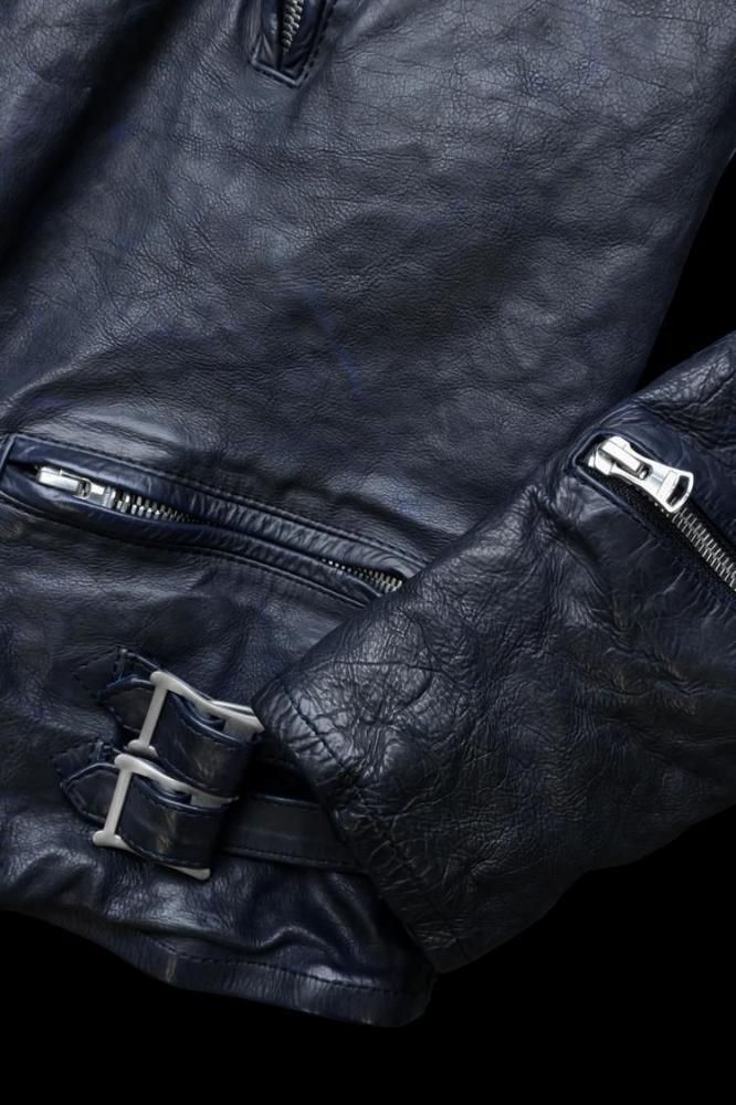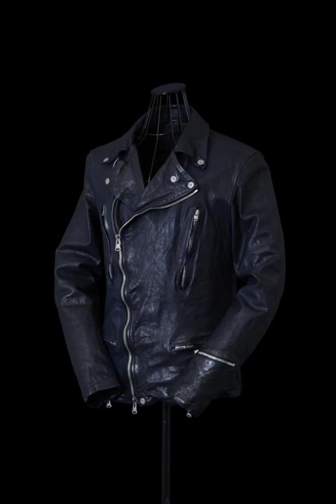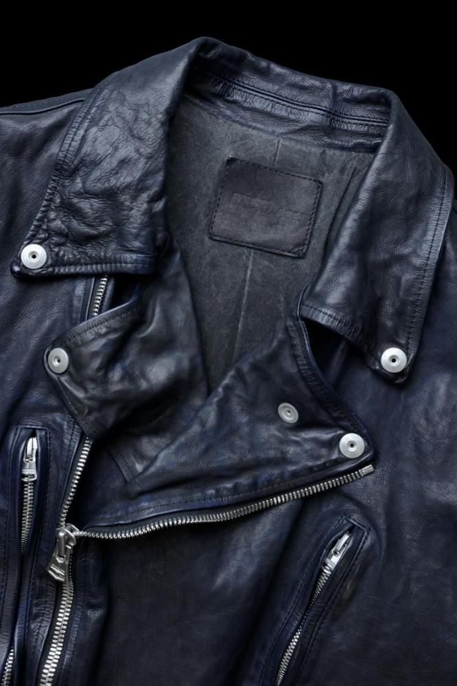 純国産に拘り国内でも有数のタンナーによって仕上げられた0.8mm厚のカーフレザーを採用。弾力の強いもっちりとした質感は身体に馴染み易く、比較的柔らかな肌に吸い付くような心地の良さを備えた質感。カーフの柔軟性のある質感の反面、独特な皺の形成が特徴で、大きく波を打つような立体的な皺が作り上げられていきます。製品染め加工による収縮を施し仕上げる加工による製作技法を、加工工程では染めを行わずに洗いのみで縮めた加工技法によるプロダクト。素上げの状態の下地を革の状態で以前まで展開しておりました"ブリリアントブルーカラー"に染色した上から、さらに黒の顔料で染め上げたのちに、洗い加工の際に黒の顔料を部分的に落とすことにより、ブルーとブラックが入り混じったムラのある表情を作り上げています。ダスト加工のような風合いを製品元より表現している為、着用による更なる濃淡/陰影が生じ、作り上げられていくのが楽しみな新色になります。製品でタンブラーでアタリを付け縮みを生じさせる畝りのあるブランドの象徴的な存在感はそのままに、色むら(チュウキ)がない点や、縮率のコントロールが取りやすい為、安定性の高いサイズ感に仕上げることに特化しています。