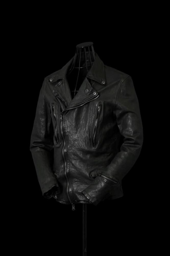 ベーシックなデザインのダブルライダースをブランドオリジナルパターンでソリッドに構築。胸部に垂直に、下方に水平2本ずつ計4本のファスナーポケットを配備、腰部の両サイドには前方に向かってダブルストラップのアジャスターを装着した英国らしさを感じさせるデザインを使用しています。高級レーヨンファブリックを裏地に採用することにより、非常に袖通しの良いライニング。ファスナーにはYKK社製高級タイプのEXCELLA(エクセラ)を採用、引手には実用性を考慮したブランドオリジナルデザイン。同マテリアルの他カラーとは異なる"ダールブラック"パーツを採用しております。