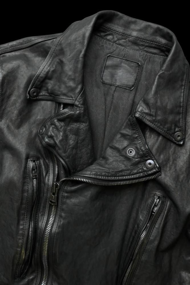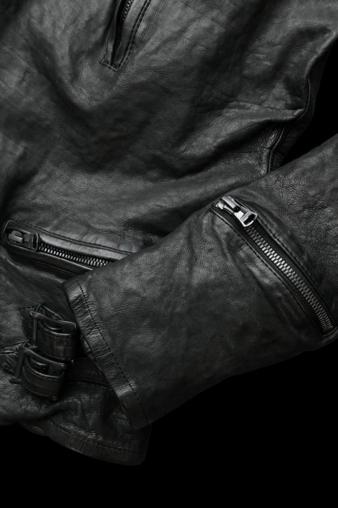 純国産に拘り国内でも有数のタンナーによって仕上げられた0.8mm厚のカーフレザーを採用。弾力の強いもっちりとした質感は身体に馴染み易く、比較的柔らかな肌に吸い付くような心地の良さを備えた質感。カーフの柔軟性のある質感の反面、独特な皺の形成が特徴で、大きく波を打つような立体的な皺が作り上げられていきます。製品染め加工による収縮を施し仕上げる加工による製作技法を、加工工程では染めを行わずに洗いのみで縮めた加工技法によるプロダクト。素上げの状態の下地を革の状態で以前まで展開しておりました"グリーンカラー"に染色した上から、さらに黒の顔料で染め上げたのちに、洗い加工の際に黒の顔料を馴染ませ部分的に落とすことにより、グリーンとブラックが入り混じったムラのある表情を作り上げています。ダスト加工のような風合いを製品元より表現している為、着用による更なる濃淡/陰影が生じ、作り上げられていくのが楽しみな新色になります。製品でタンブラーでアタリを付け縮みを生じさせる畝りのあるブランドの象徴的な存在感はそのままに、色むら(チュウキ)がない点や、縮率のコントロールが取りやすい為、安定性の高いサイズ感に仕上げることに特化しています。