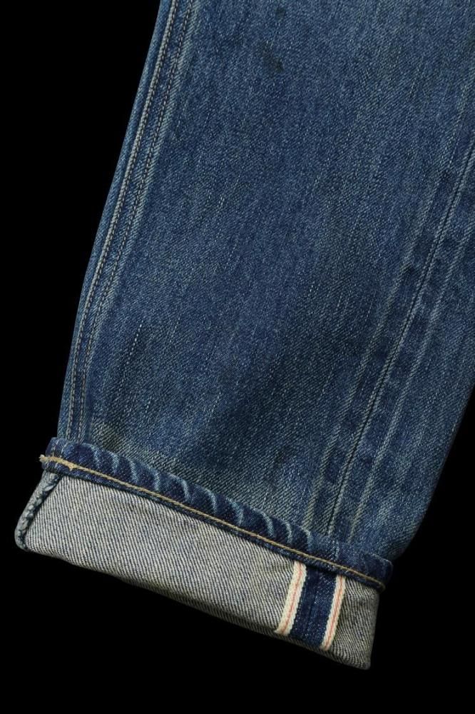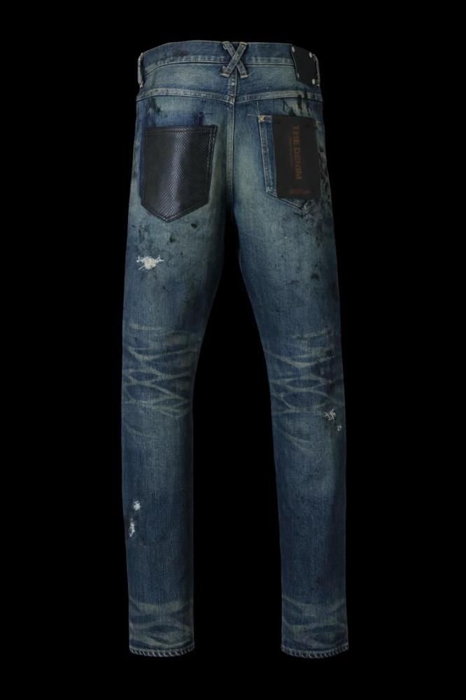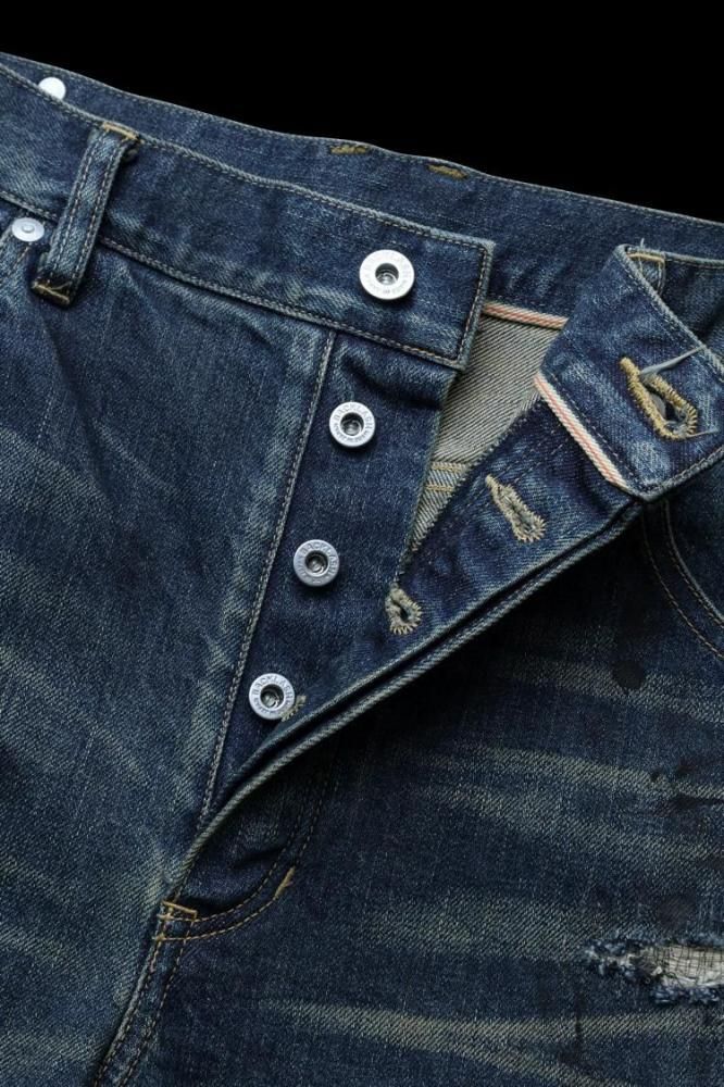 タテ7番インディゴ中白糸、ヨコ8番生成り糸を使用し、タテ糸ヨコ糸の太さを変えて織り上げたストレッチ混の"HIROSHIMAセルビッチデニム"をベースマテリアルに採用しております。ヨコ糸に生成り糸を用いることでシンプルにワンウォッシュを施した際にも、雰囲気は非常に味わい深い表情に仕上がっています。濃色加工(ダークインディゴ)に関しては、部分的なシェービングを行い、プレスで形を整えた後に、全体の擦りを再度入れております。その後、立体加工/ストーンウォッシュ/オーバーダイの工程を経た後に、吹き付け加工により細かく濃淡を付けフィニッシュした加工デニムになっています。スレキに施した文字、【REACH FOR THE MOON EVEN IF WE CANT. 〜月に手を伸ばせ、たとえ届かなくても。】は、デザイナー・ISAMU KATAYAMAに今なおインスピレーションを与えるロックワードです。