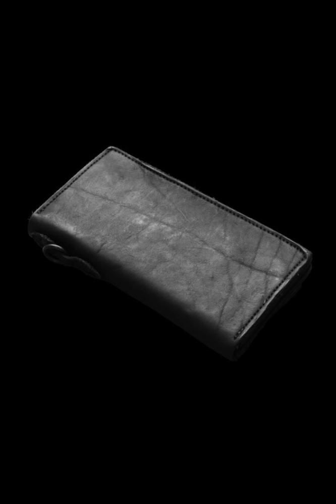 国内のタンナーにより丁寧に仕上げられたダブルショルダーレザーを採用。製品染色を施工した皮革を用い、粗野な雰囲気を表現。製品基のカサっとした質感は使用に伴い油分が浮き上がり、驚くほどに滑らかな艶のある表情に変化します。デイリーユースのウォレットこそのダブルショルダーレザー特有の硬質な質感が柔軟に深化するエイジングを最も感じていただきやすいプロダクション。屈強性に長けた厚口ショルダーレザーをダイレクトに使用し財布を構築することにより、頑丈故永くご愛用いただける上、独自の存在感放つ作品に仕上がっています。