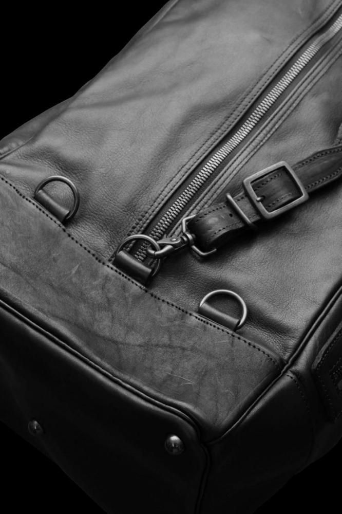 高品質国産ステアレザーの原皮に対しホワイトタンニンで鞣した素上げレザー下地を用意、さらにミモザを含めた数種類の植物性タンニンに加えオイルを合わせて再度鞣し作業を行った、柔らかくしなやかな風合いのステアレザーと、バックラッシュを象徴するマテリアルジャパンショルダーレザーをコンビネーションで使用。どちらも先に染色を行った革の状態で製品を作り上げ、洗い加工を施すことで製品染めのような風合いを出しています。発色がよく、色ムラや色ブレが少ないのが特徴的です。バッグとしての扱いやすさの理に適った異なるレザーマテリアルのコンビ使い、シルエットの良さと強度の調和が取られています。