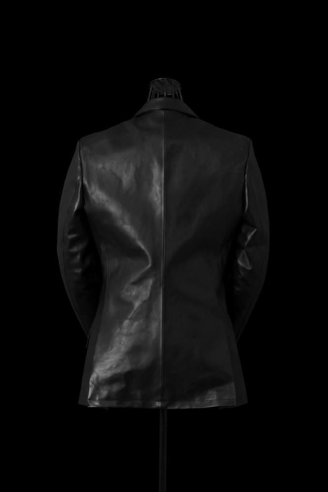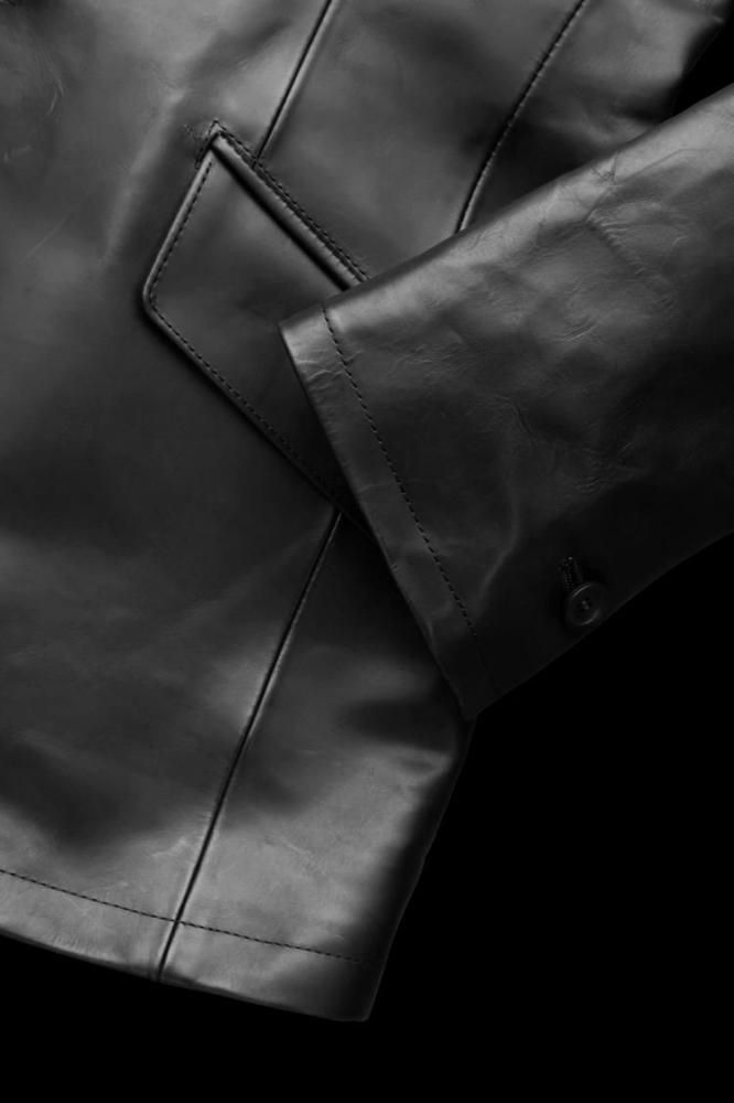 イタリアの名門タンナー”INCAS(インカス)”社製1.1mm厚のクロム鞣しカーフレザーを採用。カーフレザーを得意とし、ラグジュアリーブランド等がウェア/バッグで使用しているイタリアンカーフグレインレザーを厚さ1.1mmで仕上げたものを採用。ニュージーランド産原皮ベビーカーフ(生後3ヶ月未満の仔牛革)を従来の鞣しと違い地球環境に配慮した革となり、従来の水量を53.7%、化学薬品を32.5%削減しています。クロムとタンニン双方の良さを活かしたコンビ鞣し、着やすさと経年変化どちらも味わうことの出来る特性を併せ持っています。下地から染色した後、柔らかな革に敢えて硬仕上げコーティングを施行。ソフトな質感の革に対しハリコシを加えることで着心地とともに、着用皺の形成などのエイジングも楽しめる質感に仕上げています。過去には「BACKLASH TheLine」でも使用してきたイタリーカーフと同様のタンナーによる高品質レザー、ラグジュアリーな趣きを最大限に纏い、綺麗なシルエットに整え作られた存在感のある一着になっています。