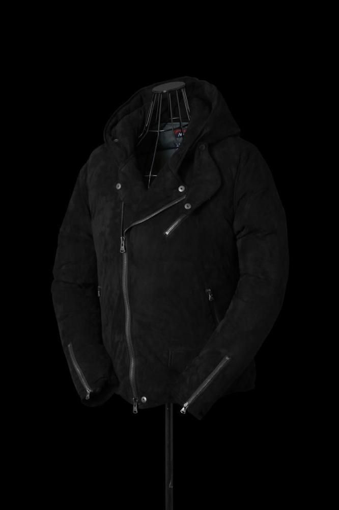 「カンガルースエードレザー+ナンガセレクトプレミアムダウン×河田フェザーポーランド産ホワイトグースダウンフーディライダースジャケット」