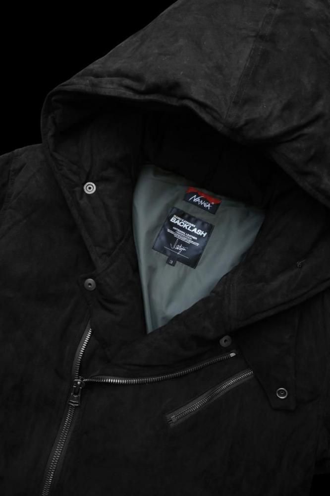BACKLASHにて展開するフーディライダースジャケットのデザインをベースに、極めて柔らかな着心地で軽く、包み込まれるようなソフトなフィット感のレザーダウンジャケットを追求し、NANGAとの共同製作により具現化されたコラボレーション製品。