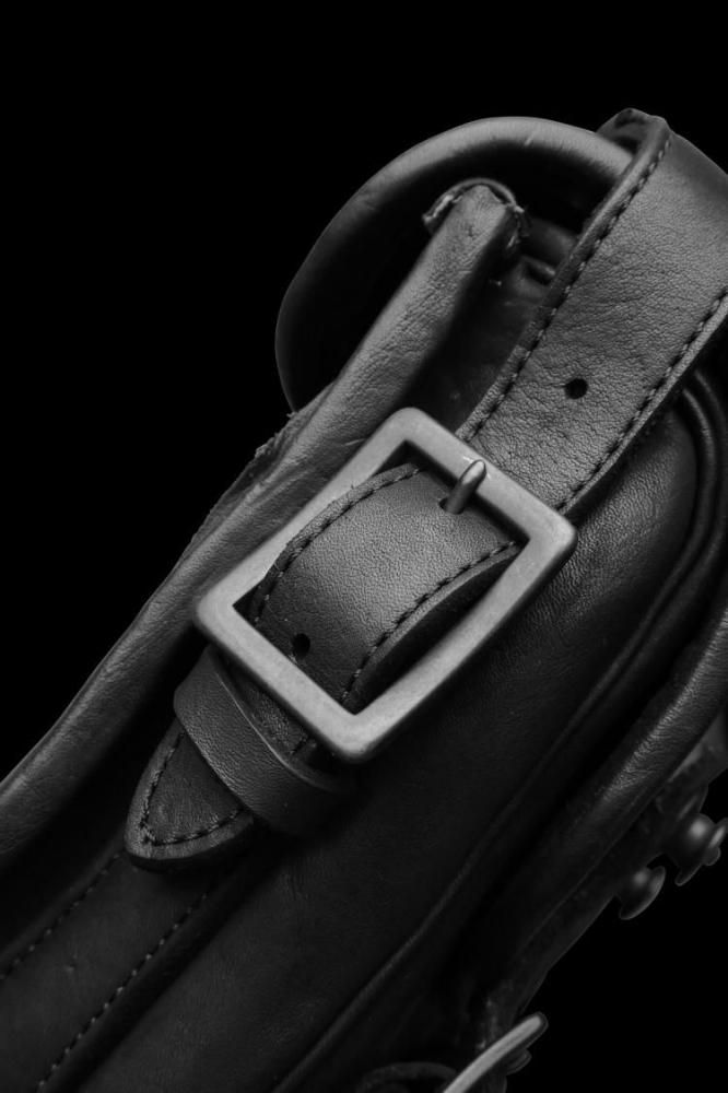 ブランドを代表する旧くより今なお最も永く採用し続けている、アイデンティティを確立したマテリアルジャパンダブルショルダー下地を使用し、製品染色加工を施し製作しています。肉厚でがっしりとした強固な質感に加えて、トラ皺が大きく形成されているケースの多い大きな肩の部位より採取されたダブルショルダーレザーを採用。独特の荒々しい革の表情をベースに、製品染色を施工し粗野な雰囲気をより一層引き立たせています。最初のマット且つ硬さのある質感は、使用を重ねる毎に柔軟性を持ちオイルが上がることによりしっとりとした手触り、鈍い光沢を放つ独自の雰囲気に深化していきます。