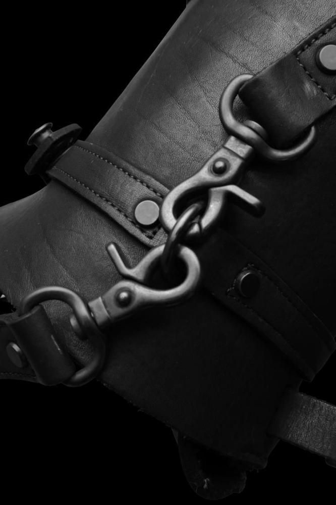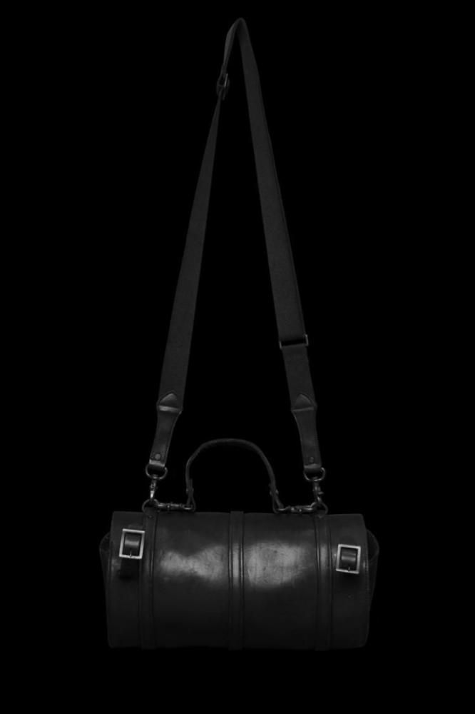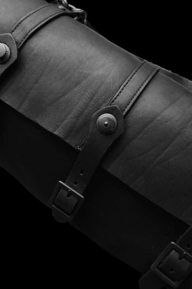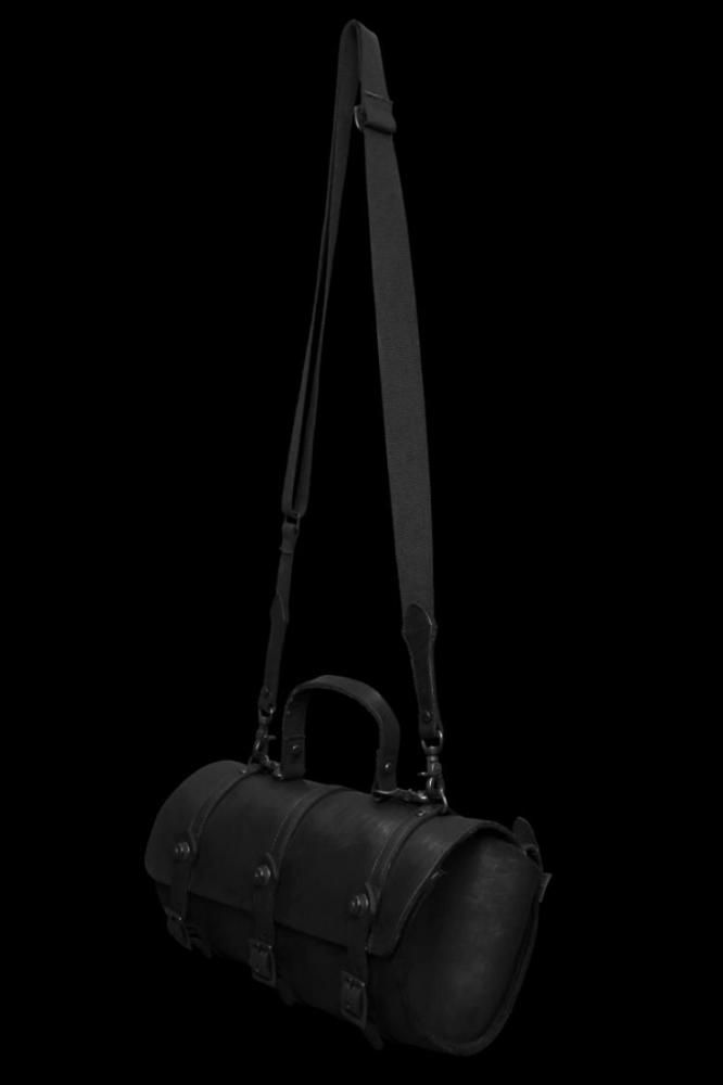 身の回りの必需品の収納に様々なシーンに最適なロールバッグをブランドオリジナルデザインにて製作。ナスカンによる簡単な脱着が可能なハンドル+ショルダーストラップによる肩掛け+手持ちの2WAY仕様に加えて、ハンドル&ショルダーストラップを外しバッグ内部に収納、バイクなどにバッグ本体を取り付けることが可能な仕様になっているため取り付け、バイク降車時にはハンドル&ショルダーストラップを装着し持ち運びお使いいただくことが出来ます。屈強性を求める故の肉厚なダブルショルダーレザーの使用、製品染め加工による風合い、マテリアルとバッグのデザインコンセプトが見事に調和しています。フロントに装着した3連ベルトはドイツホックにより片手ワンタッチでの開閉が可能、ショルダーストラップを敢えて生地で作り上げ軽量化を図り、カジュアルに扱える機能性を考慮したデザインになります。ダブルショルダーレザーをマテリアルに独自の染色加工のプロセスを経た風格のある革の風合いは、タフにお使いいただくことで抜群の佇まいのバッグへと深化します。