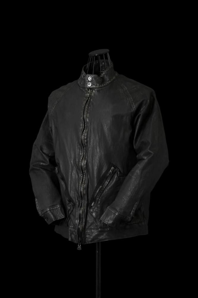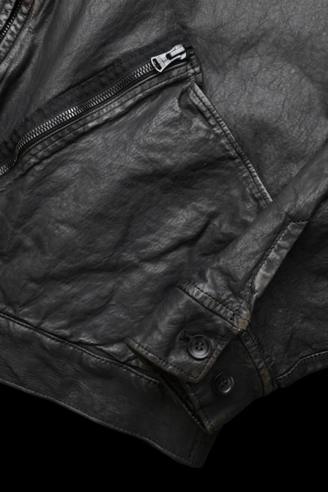 高品質国産ステアレザーの原皮に対しホワイトタンニンで鞣した素上げレザーを下地に採用。さらにミモザを含めた数種類の植物性タンニンに加えて、オイルを合わせて再度鞣し作業を行うことにより、一般的なステアレザーでは感じることの出来ないしなやかな風合いになっています。非常に柔軟な質感の下地を基にグレー色によって製品染色加工を施工。収縮加工を施した染色を行なった上でも、極めてソフトな感触に仕上がっています。サイズの調整作業を行なった後に、さらに一着一着染料のスプレー吹き付けによってブラックに染色、仕上げに特殊な液剤を用い一着一着手作業にてシェービング/シワ付けを行うことでリアルなユーズド感のある風合いを作り上げた新たなヴィンテージプロセス。たっぷりと油分を含んだ革を下地に用いることで実現した新たな手法による他に類を見ないアジのある加工感になっています。