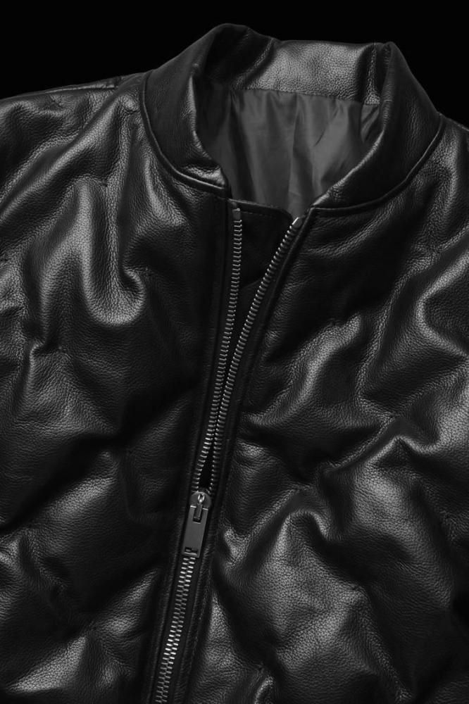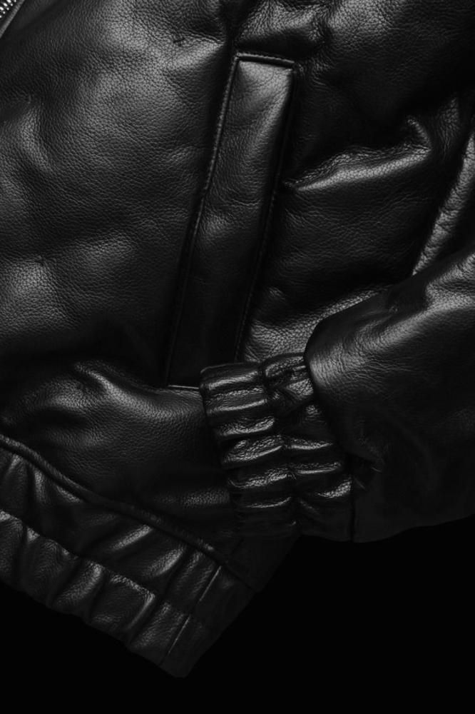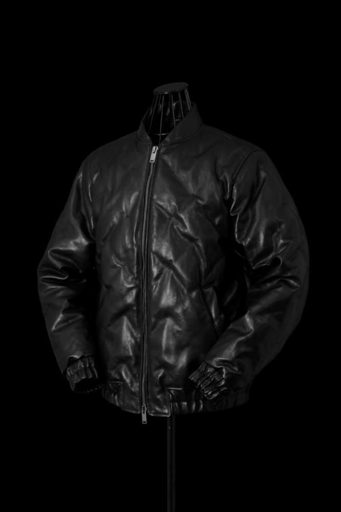 確かな防寒性、保温性は勿論、ダウン/アウターとして最上級を追求したプロダクション。ブランドを代表する冬の大定番アウターのポジションを誇ります。現代の日本の冬の気候に対しオーバースペックになり過ぎることのない適度な防寒性も考慮したMA-1タイプをデザイン。首周りや装飾をスッキリとさせ軽量でありながら決してロースペックではないちょうど良い保温性を誇ります。風の侵入を防ぐ従来編み地が用いられる襟/袖口/裾のリブ箇所も全てレザーにて製作、洗練されたレザーダウンジャケットを提案します。ファスナーにはイタリアRACCAGNI社のファスナーを採用、レザー&パーツをオールブラックに纏め上げた気品漂う雰囲気を基に程よい無骨さを感じさせる印象に仕上がっています。両サイドに内ポケットもご用意しております。