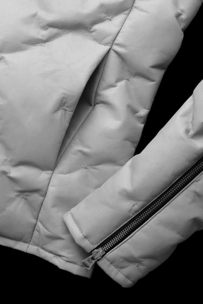 従来高級家具などで使用されるケースが多い、高品質国産クローム鞣しの素揚げステアレザーを採用。大判のレザーとゆう特性を持つ反面、高い基準で検品された版の大きさに対して傷が非常に少ない革になっています。非常に滑らかなタッチ、心地の良い柔軟性を持つ綺麗な表情が際立つ高級レザーになります。白を貴重に適度にグレーが混ざった感覚のホワイトグレーカラーに革の状態で染色しています。真白とは異なり着用に伴う自然に生まれるダートも風合いとして印象づけることを意図しています。ソフト且つライトな感覚の皮革の質感を活かし、極めてラフに抜け感を持って着用可能なブランド大定番ハンドステッチダウンジャケットを製作。点留めによって表現されたダイヤ状のステッチワークは、一般的な縫製で表現した柄見せではなく、一点一点手作業で時間を要し行うステッチの手法を用いることにより、レザーへのダメージを最小限に抑え且つ、長年着用いただいていても針穴からのダウンの抜けを限りなく防ぎ、長く温かく着用いただける利点があります。充填物には最高級ポーランド産ホワイトグースダウンを使用。ラフな着用感も確かな温かさを感じていただけるプロダクト。